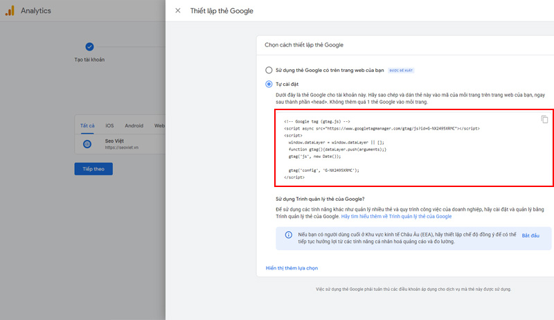 Cách 1: Cài đặt thủ công (Dán code): Google sẽ cung cấp một đoạn mã Javascript (thẻ Google). Bạn copy đoạn mã này và dán vào phần <head> của tất cả các trang trên website của mình.
