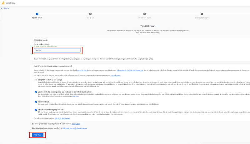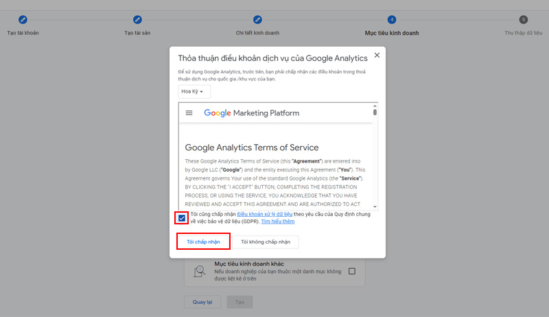 Chấp nhận điều khoản dịch vụ của Google Analytics