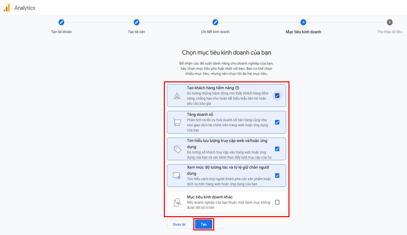 Chọn Mục tiêu kinh doanh (ví dụ: “Tăng doanh số bán hàng” hoặc “Kiểm tra hành vi người dùng”).