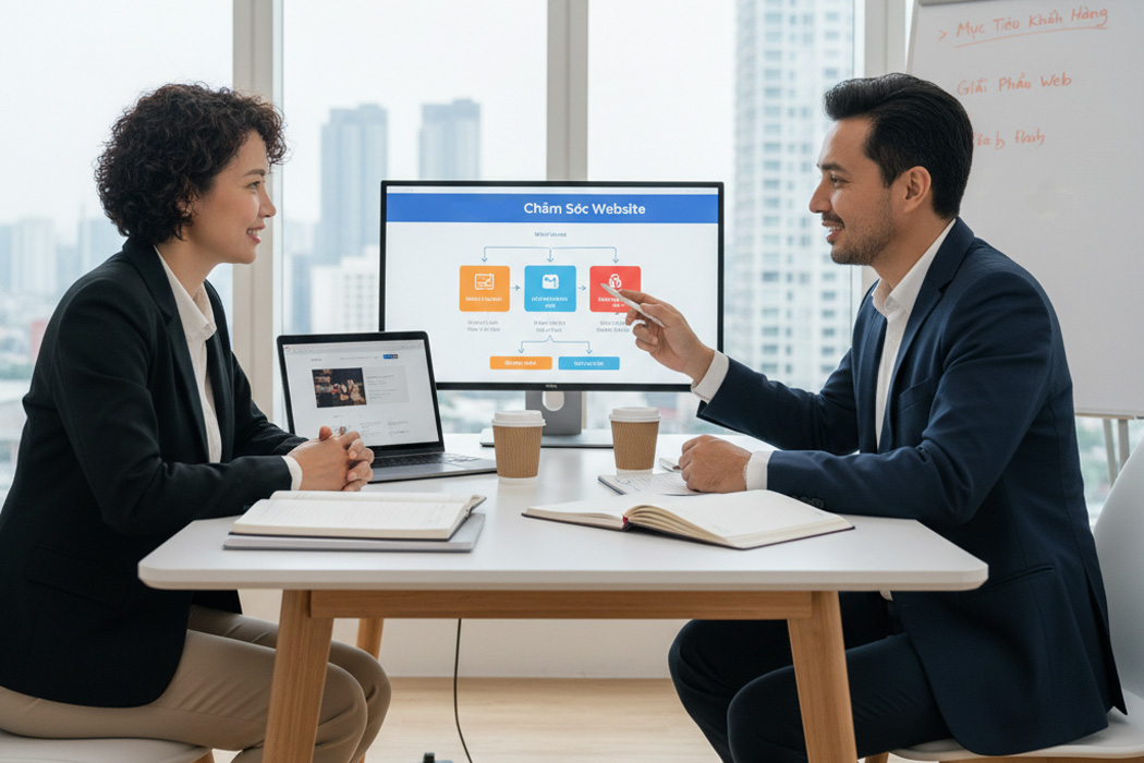 Dịch vụ chăm sóc website là dịch vụ tổng hợp bao gồm các hoạt động nhằm duy trì, cập nhật, tối ưu và bảo mật cho một website sau khi đã được thiết kế và đưa vào hoạt động. Mục tiêu là đảm bảo website luôn vận hành ổn định, chuyên nghiệp và hỗ trợ tốt cho hoạt động kinh doanh hoặc truyền thông của doanh nghiệp.