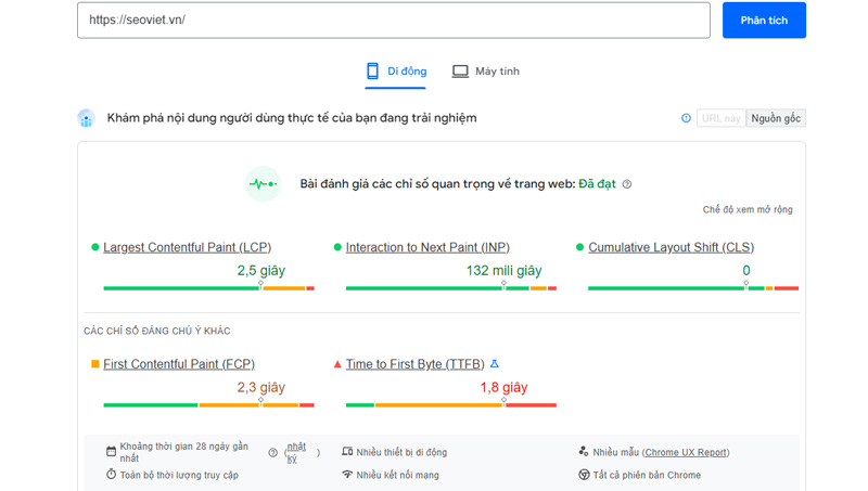 - Google PageSpeed Insights: Công cụ này sử dụng dữ liệu từ Chrome User Experience Report (CrUX) để cung cấp báo cáo INP thực tế của từng URL hoặc toàn bộ website. Bạn chỉ cần nhập địa chỉ trang, công cụ sẽ trả về giá trị INP cùng các đề xuất tối ưu.